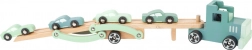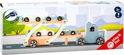 Zestaw zawiera ciężarówkę z naczepą oraz łącznie cztery sportowe autka. Zabawa rozwija koordynację oko–ręka, małą motorykę oraz kreatywne opowiadanie historii. Dzięki wysokiej jakości materiałom i gładko wykończonym krawędziom zabawka jest odpowiednia dla dzieci od 3 lat.