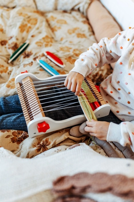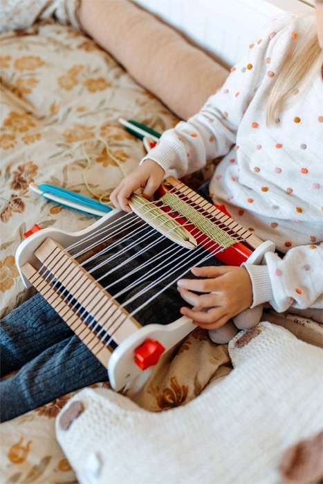 Kompaktowa, biurkowa konstrukcja z przejrzystym prowadzeniem osnowy i prostym przewlekaniem wątku ułatwia dzieciom zrozumienie podstaw tkania już od pierwszej próby.