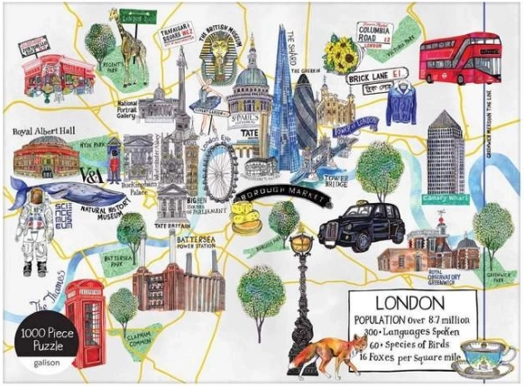 Te designerskie puzzle przedstawiają barwną i szczegółową mapę LONDYNU z kultowymi zabytkami, takimi jak Buckingham Palace, Trafalgar Square, Royal Albert Hall, Tower Bridge czy London Eye. Stylowe, matowe opakowanie ucieszy jako prezent i dekoracyjny element do biblioteczki. Autor ilustracji: Hennie Haworth.