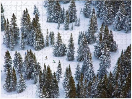 Odkryj ponadczasowe ujęcia z lotu ptaka autorstwa GRAY MALIN w formie premium dwustronnych puzzli. Jedna strona przeniesie Cię w spokojny zimowy pejzaż ze śnieżnymi drzewami, druga ożywa dynamiką kolorowych narciarzy na lśniąco białym śniegu. Każdy element pasuje idealnie, dzięki czemu układanie jest płynne i satysfakcjonujące.