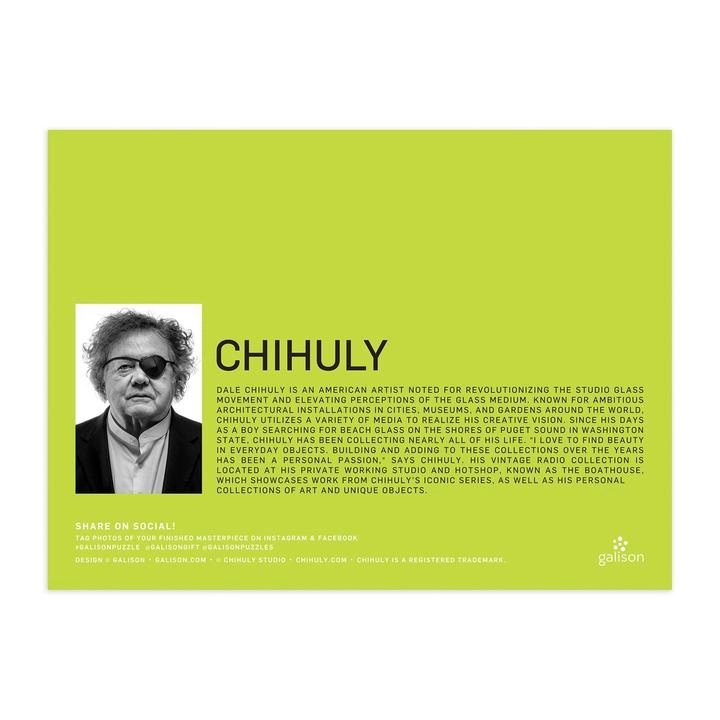 Stylowe puzzle z motywem vintage przenośnych radioodbiorników ucieszą miłośników designu i kolekcjonerów. Artysta Dale Chihuly czerpał inspirację ze swojej wieloletniej kolekcji, dzięki czemu powstał obraz pełen detali i kolorów. Wysokiej jakości druk i solidne elementy z papieru z recyklingu gwarantują przyjemność z każdego układania.