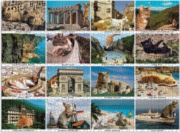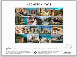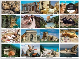 Śmieszna układanka z kotami na wakacjach składająca się z 1500 elementów oferuje zabawę i relaks. Zawiera szesnaście realistycznych fotografii, na których można podziwiać koty zachwycające się znanymi miejscami na świecie.