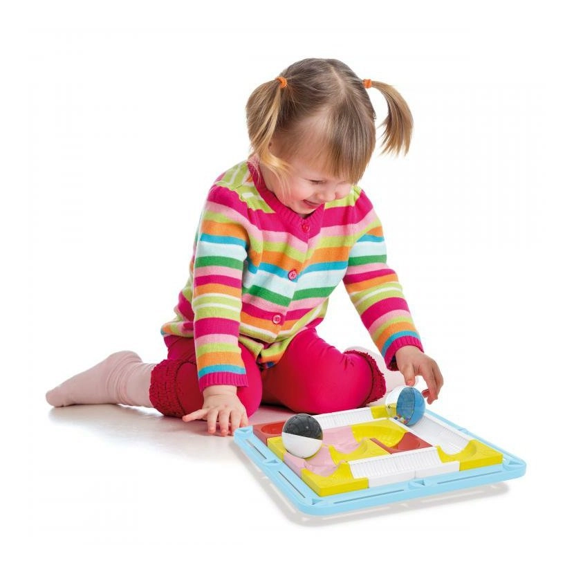 Prowadzenie kulek przez przeszkody poprawia chwyt, precyzję ruchów oraz koordynację oko–ręka u najmłodszych dzieci.