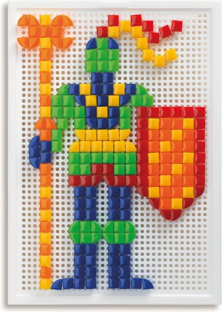 Zestaw zawiera 300 kołeczków w kształcie kwadracików i trójkątów w żywych kolorach. Dzieci ćwiczą rozpoznawanie kształtów, sortowanie oraz układanie obrazów.