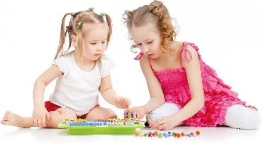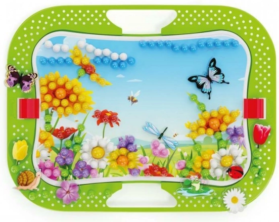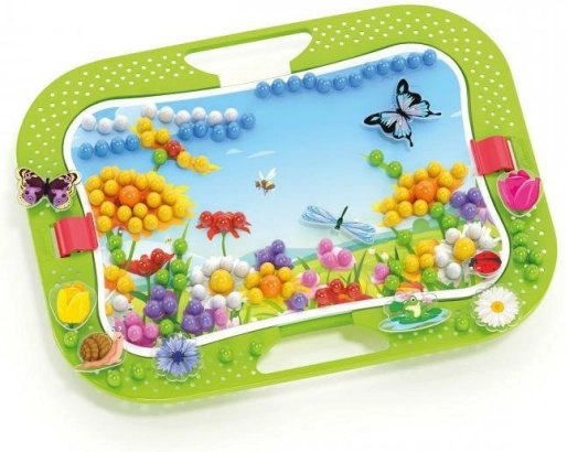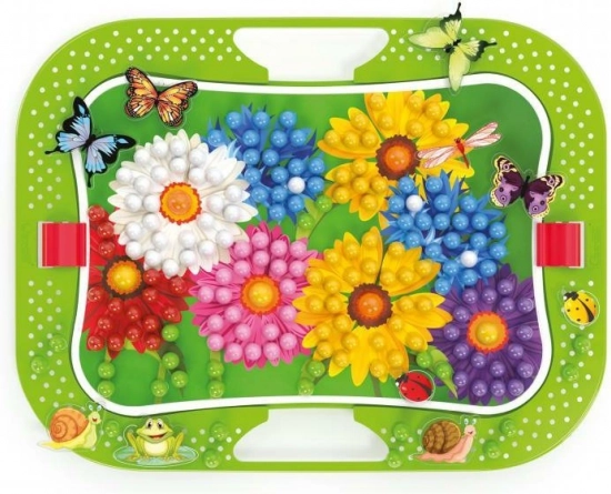 Stwórz z kołeczków swój kwitnący ogród! Klasyczne kołeczki Quercetti w kolorowej wersji przedstawiającej świat natury. Zestaw zawiera kołeczki w różnych kolorach i średnicach, których układanie pozwala tworzyć rozmaite krajobrazy, a także mnóstwo naklejek i figurek motyli, ważek, biedronek i innych stworzeń, którymi możesz zasiedlić swój naturalny świat. Zawartość opakowania: 1 perforowana podkładka 28 × 20 cm, 2 obrazki wzorcowe, 300 kołeczków w 6 różnych kolorach, 16 figurek, 1 podstawka ze stojakiem, 1 drewniane pióro do przebijania. Główne zalety: rozwija małą motorykę, kreatywność i wyobraźnię, zawiera 316 guzików, dla dzieci od 3 lat.