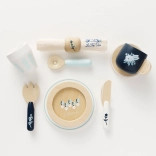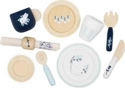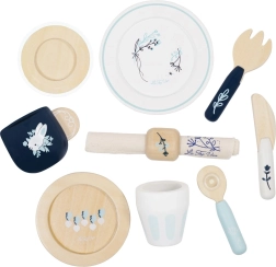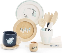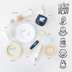 W zestawie znajdziesz wszystko do małego serwowania: filiżankę, spodek, kubek, 2 talerze, nóż, widelec, łyżkę oraz tekstylną serwetkę z dekoracyjnym pierścieniem. Dzieci podczas serwowania rozwijają kreatywność, sprawność manualną i uczą się podstaw savoir-vivre’u przy stole. Wykonano etycznie z zrównoważonego drewna FSC z naciskiem na jakość i bezpieczeństwo.