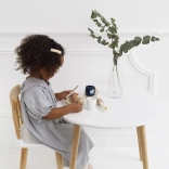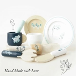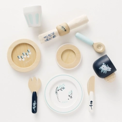 Ten wysokiej jakości dziecięcy zestaw obiadowy został zaprojektowany tak, aby służył przez długi czas, a jednocześnie pięknie wyglądał w każdym dziecięcym pokoju. Eleganckie niebiesko–białe motywy z ilustracjami roślin, gładkie drewniane powierzchnie i bezpieczne farby na bazie wody czynią go idealnym wyborem do codziennej zabawy.