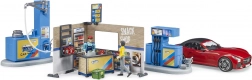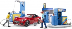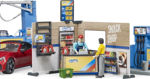 W komplecie znajduje się wszechstronne sportowe auto ze zdejmowanymi kołami i dachem, w pełni kompatybilne z figurkami i akcesoriami BRUDER BWORLD. Dwustronnie zadrukowane tła, półki z kanistrami i cennik wspierają kreatywną i edukacyjną zabawę.