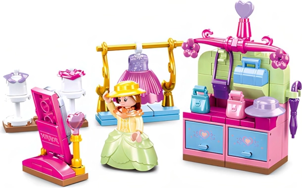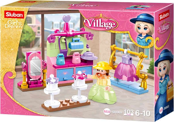 Klocki Sluban Sklep z odzieżą w stylu retro zapewniają świetną zabawę dzięki prostocie oraz możliwości tworzenia własnych scenariuszy. Zestaw zawiera 103 elementy i jedną figurkę, co pozwala odgrywać różne modowe scenki w sklepie.