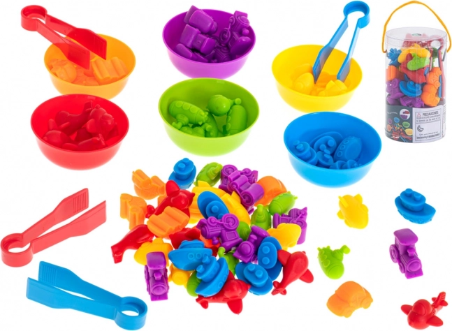 Kolorowy zestaw edukacyjny z 36 mini pojazdami, 6 miskami do sortowania i 2 pęsetami wspiera naukę liczenia, rozróżnianie kolorów oraz małą motorykę. Świetna aktywność inspirowana metodą Montessori dla dzieci, które kochają samochody i naukę przez zabawę.
