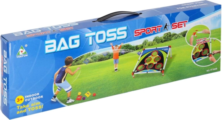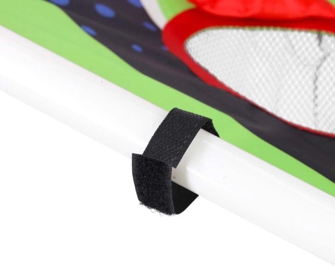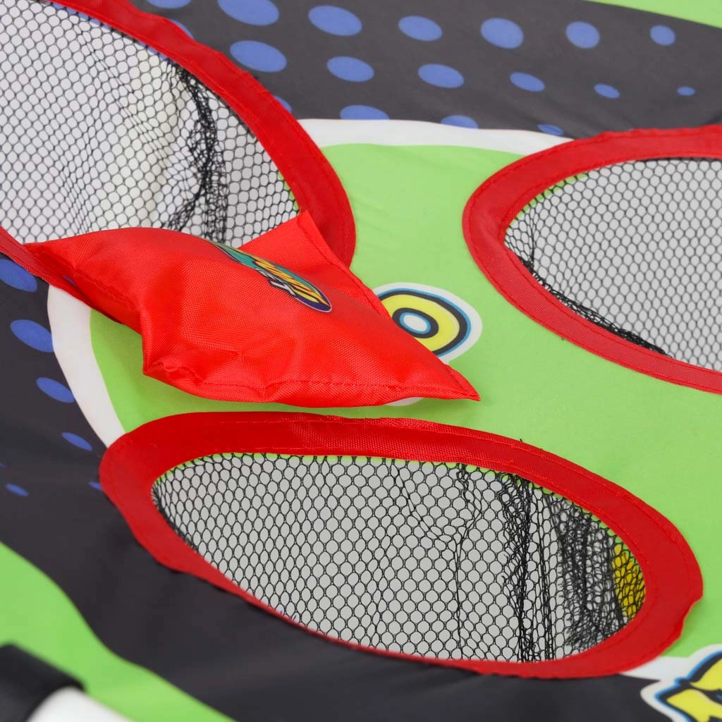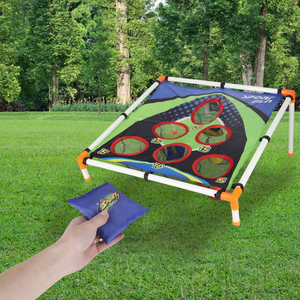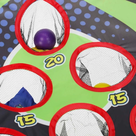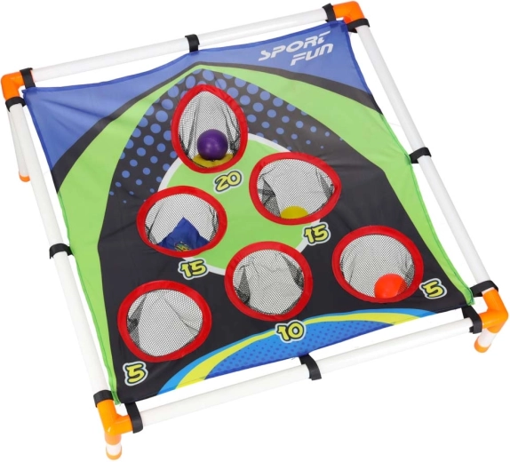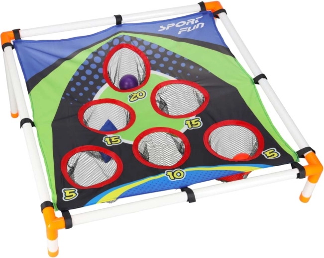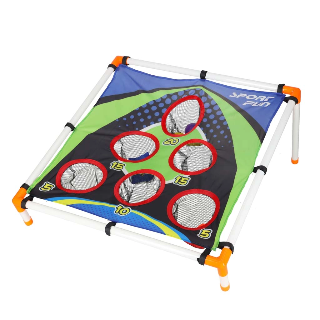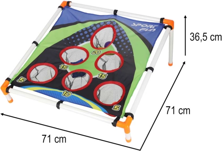 Lekka konstrukcja z plastikowych rurek z pochylonym stojakiem zapewnia stabilność, a wytrzymała tekstylna powierzchnia z pięcioma do sześciu punktowanymi otworami zatrzymuje woreczki i piłeczki w siateczkach. Montaż jest intuicyjny, a całe „boisko” łatwo przenieść gdziekolwiek.
