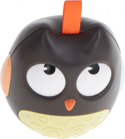 Kontrastowe detale, ruchome duże oczy i delikatne grzechotanie wewnętrznych dzwoneczków naturalnie przyciągają uwagę. Różne struktury powierzchni oraz praktyczna pętelka na górze rozwijają małą motorykę i wrażenia dotykowe.
