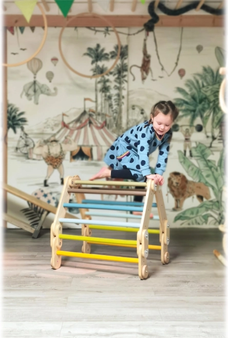 Ta drabinka wspinaczkowa jest wykonana z wysokiej jakości połączenia sklejki i litego drewna, co zapewnia jej trwałość i stabilność. Dzięki możliwości rozłożenia w kilku kształtach oferuje szerokie możliwości zabawy i jest również wyjątkowo łatwa w przechowywaniu. Idealna do rozwijania równowagi i umiejętności motorycznych dzieci, a także można ją wykorzystać podczas terapii ruchowej.