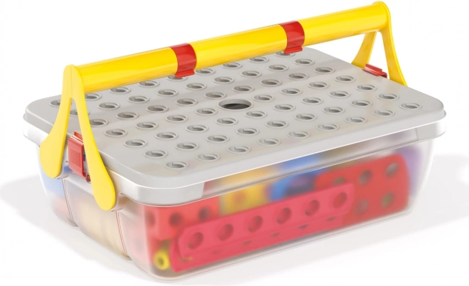 Wszystkie elementy schowasz w solidnym pudełku z rączką. Perforowane wieko służy jako powierzchnia do budowania – idealne w domu i w podróży.