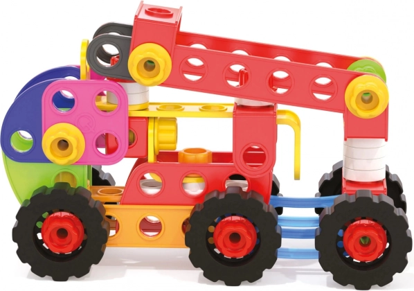 Śrubki, nakrętki i perforowane płytki łatwo się łączą i trzymają. Dzieci zbudują auta, traktory, żurawie oraz własne modele – prosto i bezpiecznie.