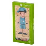 Zestaw zawiera drewnianą podstawę i 28 indywidualnych elementów, które układają się od szkieletu aż do odzieży postaci. Dzięki prostemu designowi i naturalnym materiałom puzzle wspierają zasady metody Montessori, która skupia się na wszechstronnym rozwoju dziecka.