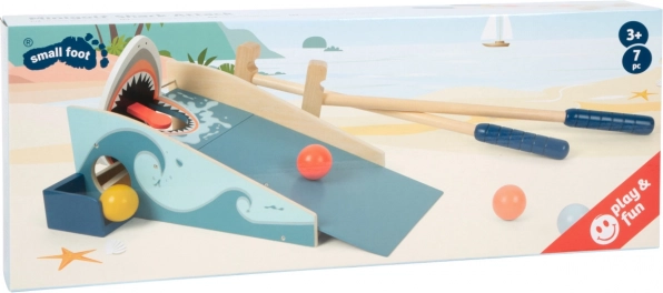 Zamień każdy pokój lub ogród w mini boisko! Drewniany minigolf z rekiną paszczą zapewnia dzieciom dynamiczną zabawę i trening motoryki dużej, koordynacji oko–ręka oraz cierpliwości. Wystarczy puścić piłeczkę po niebieskiej rampie jak po fali i trafić w otwartą paszczę – rekin przy trafieniu ją zamknie, a wy świętujecie wynik.