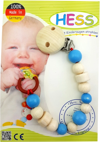 Praktyczny klips na smoczek w delikatnym, jasnoniebieskim kolorze utrzymuje smoczek zawsze pod ręką i w czystości. Posiada metalowy klips do bezpiecznego przypięcia do ubrania oraz uniwersalny silikonowy pierścień do mocowania większości smoczków. Wyprodukowano w Niemczech z wysokiej jakości drewna z nieszkodliwymi farbami, odpornymi na ślinę i pot.