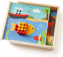 Odkryj zabawną mozaikę z motywem plaży, która rozwija dziecięcą wyobraźnię i umiejętności. Zawiera 4 obrazki i 96 kołeczków w 8 kolorach, które dzieci układają na wieczku praktycznego pudełka. Zabawa wspiera rozpoznawanie kolorów, motorykę małą, koncentrację oraz logiczne myślenie. Wykonana z wysokiej jakości, odpowiedzialnie pozyskiwanego drewna – przyjemnego w dotyku i idealnego w podróży.