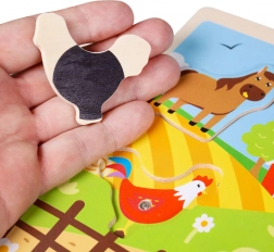 Drewniane elementy po włożeniu wydają charakterystyczne odgłosy zwierząt, co pozwala dzieciom przyporządkować dźwięk do właściwego zwierzęcia.