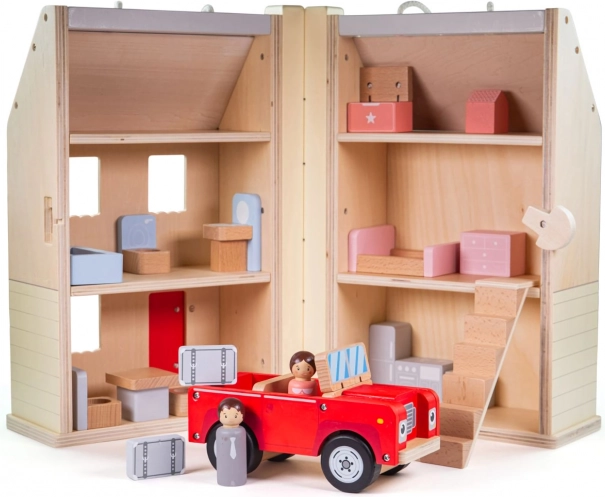 Składany drewniany domek BIGJIGS TOYS z meblami, figurkami i samochodzikiem. Przenośny, bezpieczny i kreatywny zestaw dla dzieci od 18 miesięcy.
