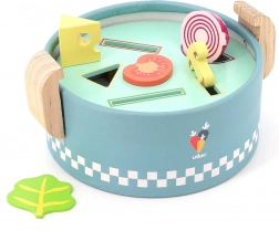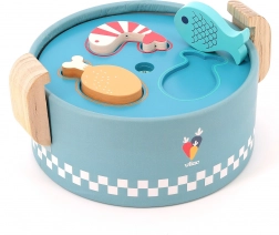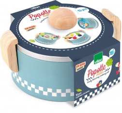 VILAC wkładany mini garnek to sprytna drewniana zabawka dla najmłodszych od 18 miesięcy. Pod pokrywką kryją się trzy wymienne płytki z różnymi kształtami, do których dzieci wkładają lub wrzucają kolorowe kawałki jedzenia. Powstaje w ten sposób „gotowanie” jak naprawdę, które rozwija wyobraźnię i umiejętności praktyczne.