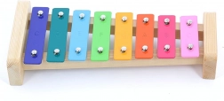 Ksylofon z tęczowymi metalowymi klawiszami na drewnianej podstawie. Każdy klawisz jest oznaczony nutą, co ułatwia naukę muzyki.