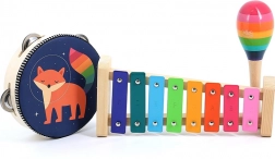 Zestaw obejmuje ksylofon, tamburyn, trójkąt i marakasy, dzięki czemu stanowi doskonałe narzędzie edukacyjne do rozwoju umiejętności muzycznych i poczucia rytmu u dzieci.