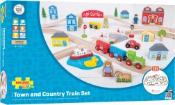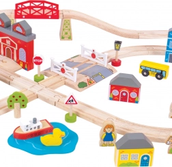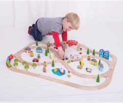 Kompleksowa sceneria miejska i wiejska z mostem, przejazdem, budynkami, drzewami i figurkami zapewni dzieciom bogatą inspirację do zabawy i rozwoju wyobraźni.