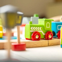 Zestaw wykonany jest z wytrzymałego drewna z elementami metalowymi i magnesami, co ułatwia łączenie wagoników. Elementy są kompatybilne z większością drewnianych kolejek na rynku, więc możesz dalej rozbudowywać swoją linię. Bezpieczna konstrukcja i intensywne kolory wspierają rozwój sensoryczny i małą motorykę.