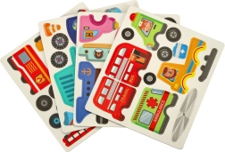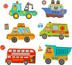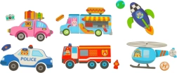 Autobus, karetka, taksówka, radiowóz, ciężarówka, statek i rakieta. Elementy dodatkowe, takie jak pachołki czy znaki, ożywiają każdą scenę.
