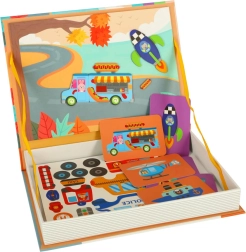 Zabawa naturalnie rozwija motorykę małą palców, percepcję wzrokową i myślenie logiczne. Opowiadanie historii do gotowych obrazków dodatkowo świetnie wspiera umiejętności komunikacyjne i wspólną rodzinną zabawę. Dzięki kompaktowym wymiarom magnetyczna książka idealnie sprawdza się w podróży i w domu.