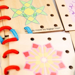 Zestaw zawiera 16 solidnych drewnianych obrazków oraz wiele tekstylnych sznurowadeł w kolorach: niebieskim, czarnym, zielonym, czerwonym, żółtym i brązowym. Produkt wykonany jest z wysokiej jakości, odpowiedzialnie pozyskiwanego drewna i spełnia aktualne europejskie normy bezpieczeństwa.