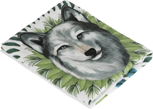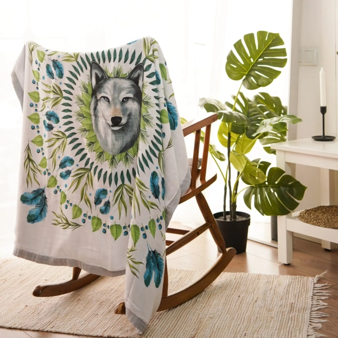 Piękny motyw wilka otoczonego zielonymi liśćmi i niebieskimi piórkami budzi odwagę. Element dekoracyjny nadaje wnętrzu unikalny wygląd.