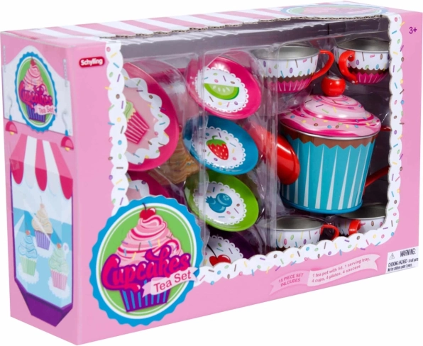 Cały zestaw jest zaprojektowany z jasnymi kolorami i motywami zdobionych muffinów, co czyni go idealnym wyborem na wyimaginowane herbatki.