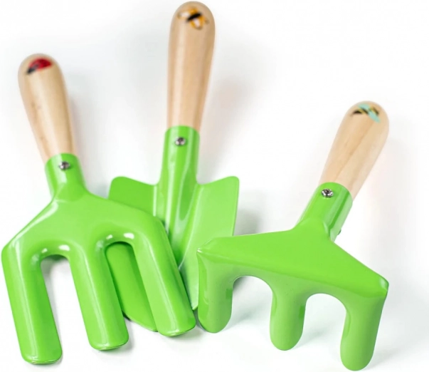 Każdy element zaprojektowano z myślą o małych dłoniach: gładkie drewniane uchwyty wygodnie leżą w dłoni, metalowe części są trwałe, a materiałowe rękawice chronią podczas pracy. Zestaw świetnie sprawdzi się w ogrodzie i na piaskownicy, a dzięki poręcznemu opakowaniu wszystko jest zawsze pod ręką.