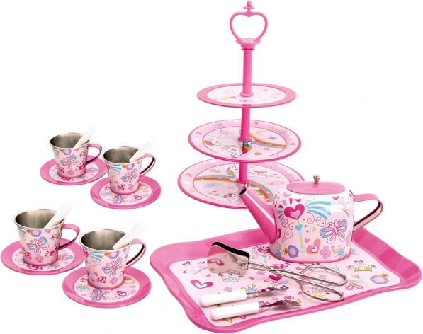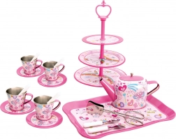 Podaruj dzieciom radość z własnego przyjęcia herbacianego. Kompletny dziecięcy zestaw do herbaty ze stojakiem na słodkości od BINO zawiera dzbanek, filiżanki ze spodkami, talerzyki, tacę, sztućce oraz piętrowy stojak z makaronikami i innymi smakołykami. Dzięki lekkiemu metalowi i wysokiej jakości plastikowi zestaw jest solidny, łatwy do przenoszenia i odporny na codzienną zabawę.
