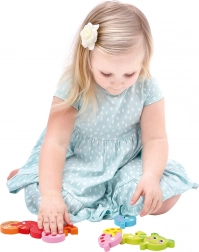 Trwałe wykonanie z litego drewna oraz intensywne, bezpieczne farby zapewniają długą żywotność i bezpieczną zabawę. Elementy są wystarczająco duże i łatwo mieszczą się w małych dłoniach, dzięki czemu układanka jest odpowiednia także dla początkujących.