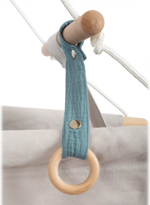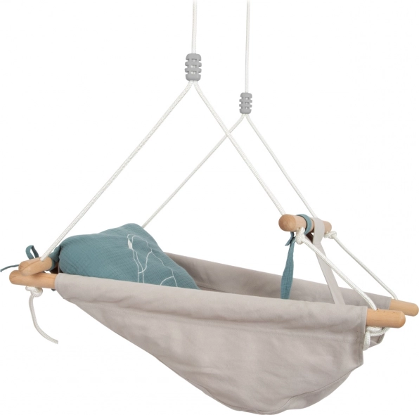 Tkanina leżyska optymalnie dopasowuje się do kształtu ciała dziecka i jest łatwa do utrzymania. Drewniana konstrukcja jest wykonana z wysokiej jakości naturalnych materiałów, które podkreślają ekologię i bezpieczeństwo. Obciążenie huśtawki wynosi do 30 kg, co zapewnia długotrwałe użytkowanie.