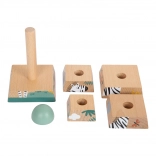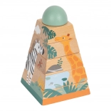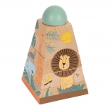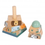 Ta zabawka z wytrzymałego drewna daje dzieciom możliwość doskonalenia umiejętności motorycznych i koordynacji ręka-oko. Składa się z sześciu elementów, które przy prawidłowym ułożeniu odsłaniają wesołe zwierzęta zamieszkujące safari. Wieża świetnie sprawdzi się nie tylko jako narzędzie edukacyjne, ale też estetycznie dopełni każdy dziecięcy pokój swoimi żywymi kolorami.