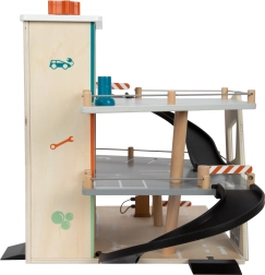 W zestawie znajdują się dwa samochodziki oraz dopracowane akcesoria: stacja paliw i ładowania, podnośnik oraz myjnia z tekstylnymi szczotkami. Solidne wykonanie z grubej drewnianej sklejki z elementami z litego drewna i bezpiecznego tworzywa gwarantuje stabilność i trwałość. Produkt wymaga montażu; w opakowaniu znajduje się ilustrowana instrukcja.