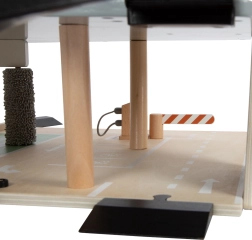 To designerskie drewniane wyścigowe parkingowisko oferuje dzieciom bogato wyposażony świat zabawy. Trzy piętra połączone są działającą windą i dwiema płynnymi rampami, które umożliwiają swobodny ruch samochodzików. Każdy poziom wyposażono w mechaniczny szlaban i gumowe barierki, co zwiększa dynamikę i zapobiega wypadaniu pojazdów. Kolorowe ikony i oznakowanie drogowe wspierają naukę przez zabawę i rozwijają wyobraźnię.