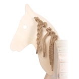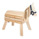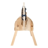Drewniany koń dla dzieci wykonany jest z wytrzymałego, surowego drewna, które w razie potrzeby można zabezpieczyć lakierem ochronnym. Wysokość grzbietu konia to 50 cm, co umożliwia łatwy dostęp także młodszym dzieciom. Koń stoi na stabilnych nogach, dzięki czemu jest bezpieczny podczas zabawy w domu i na zewnątrz. W zestawie znajduje się kantar, do którego można przymocować linkę prowadzącą dla większej interakcji podczas zabawy. Drewniany koń wspiera rozwój wyobraźni i motoryki małej dzięki sizalowej grzywie i ogonowi, które można zaplatać i czesać.