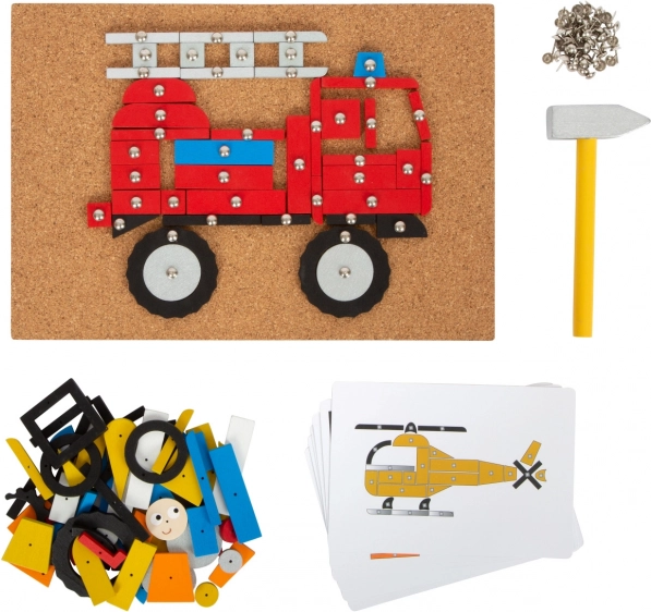 Obszerna kreatywna zestaw do zabawy o tematyce transportu, zawierająca korkową podkładkę, drewniany młotek oraz wiele drewnianych elementów o różnych kształtach i kolorach. Pomaga rozwijać kreatywność, zręczność oraz koordynację ręka-oko.