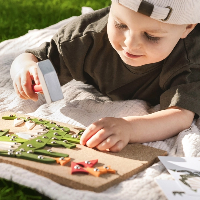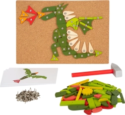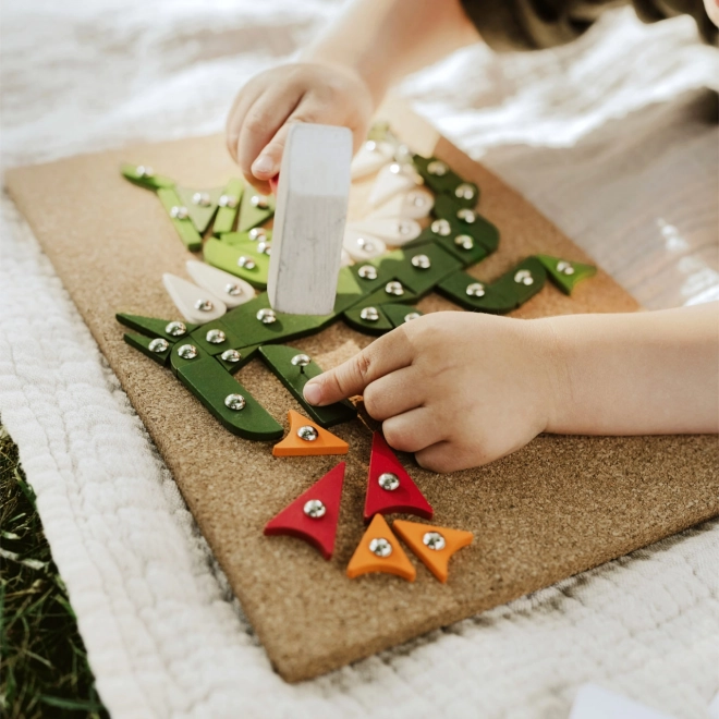 Kreatywna gra do wbijania dla dzieci, która rozwija ich małą motorykę i kreatywność. Zestaw zawiera korkową podkładkę, drewniany młotek oraz różne kolorowe drewniane elementy.