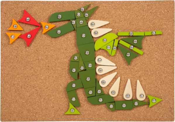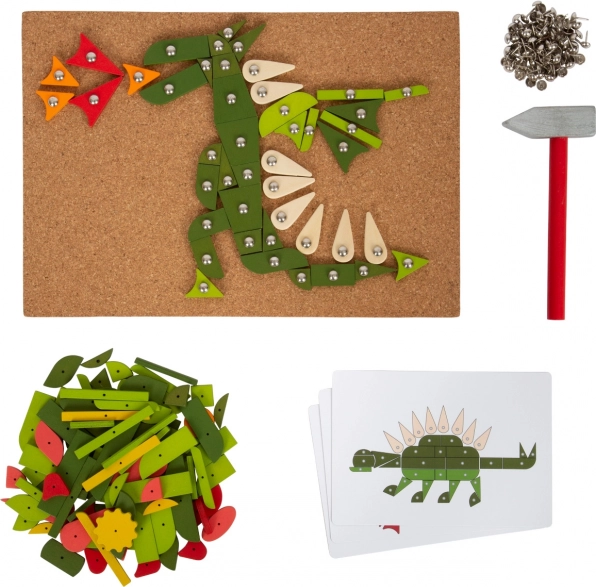 Zestaw zawiera korkową podkładkę, drewniany młotek, kolorowe elementy oraz pinezki do tworzenia obrazków.