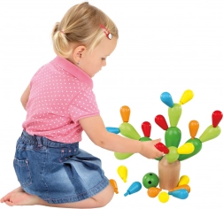 Dzieci układają kolorowe „pędy” na drewnianej podstawie i szukają równowagi, aby kaktus się nie przewrócił. Dzięki gładkim, obłym kształtom elementy łatwo się chwyta i układa. Gra rozwija cierpliwość, planowanie i wyczucie równowagi.