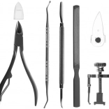 - Kompletny zestaw narzędzi – pilnik, osłona ochronna, popychacz do skórek, obcinacz, korektor i podważacz.