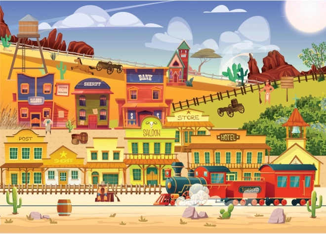 Odkryj premiumowe puzzle z motywem miasteczka westernowego i parowego pociągu od BRAIN TREE. Ciesz się matowym wykończeniem dla doskonałej widoczności detali, precyzyjnie wycinanymi elementami o losowych kształtach oraz bogatymi akcesoriami, w tym plakatem, przegródkami do sortowania, podstawką na wieko i zamykanym woreczkiem.