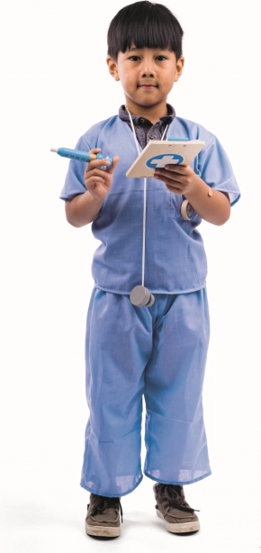 - Koszulka, spodnie, drewniany stetoskop, podkładka lekarska, termometr, zegar kieszonkowy, strzykawka, plastry